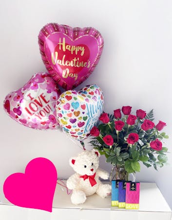 Show your love with this ultimate combo of roses in the color of your choice, delicious chocolates, a romantic mylar balloon and a cuddly teddy bear!