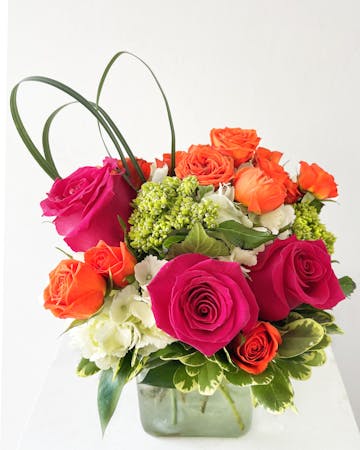 This stunning glass cube arrangement is a beautiful combination of green and white hydrangea as the base, complemented by hot pink roses, orange spray roses, lily grass loops, and lush greens. A stunning display of vibrant colors and textures. It brings together elements of elegance, energy, and natural beauty to create a memorable and visually captivating floral arrangement.