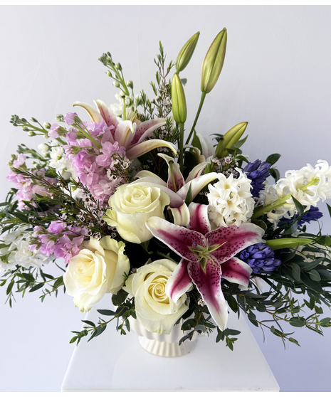 A soft, romantic garden-style arrangement featuring fragrant stargazer lilies, creamy ivory roses, delicate pink stock, and seasonal accents of hyacinth and waxflower. Designed with airy movement and layered greenery, this piece feels fresh, elegant, and effortlessly beautiful.