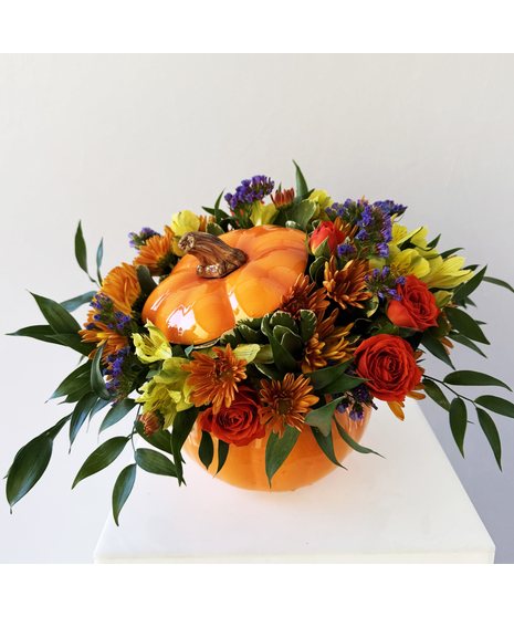 Colors of flowers and varieties may vary due to availability. A white pumpkin may be needed for substitution of the orange.