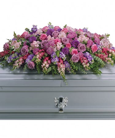 Like a heartfelt embrace, this beautiful casket spray delivers comfort and love in an extraordinary way. A wonderful array of lavender and pink flowers with just the right amount of greenery is a lovely way to pay tribute to someone who will always be with you in heart, mind and spirit.