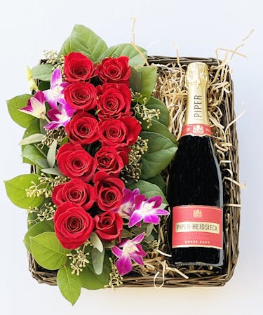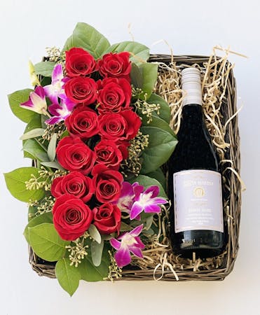 This arrangement is perfect for occasions such as anniversaries, birthdays, or as a romantic gesture to surprise and delight a loved one. It combines the timeless beauty of roses with the joy of celebrating with a bottle of champagne or wine.