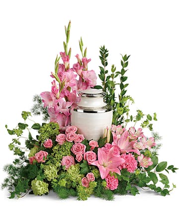 Honor the cremation urn with this pristine pink arrangement of hydrangea, roses and lilies, a soft, feminine tribute to an inspiring life.
