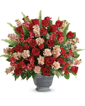 This majestic mix of red roses and fresh greens in a large, stone-inspired pot is a show of strength and support.
