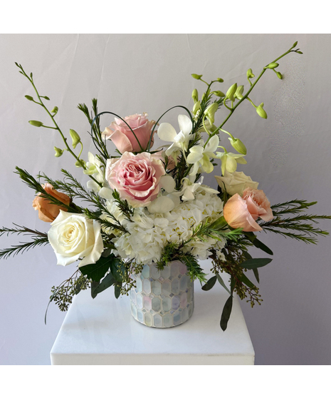 Blush and ivory roses are artfully arranged with white hydrangea and delicate orchid accents, creating a graceful palette of creamy whites and ballet pinks. Textural greenery adds movement and a natural, garden-inspired feel, while a hand-shaped lily grass heart rises gently above the blooms — a refined symbol of love and thoughtful design.
