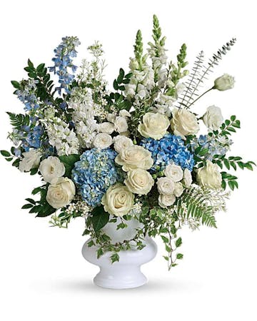 Honor the memory of your beloved with this breathtaking bouquet in colors of sky blue and cloud white roses.
