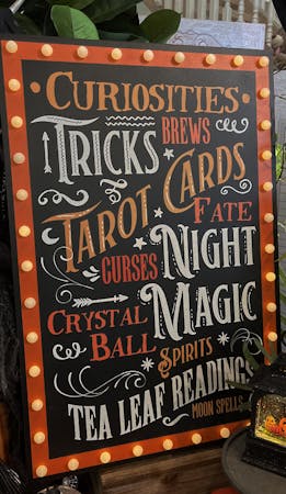 This classic light up Halloween sign features curiosities, tricks, brews, tarot cars, fate, curses, night magic, crystal balls, spirits, tea leaf readings and moon spells!
