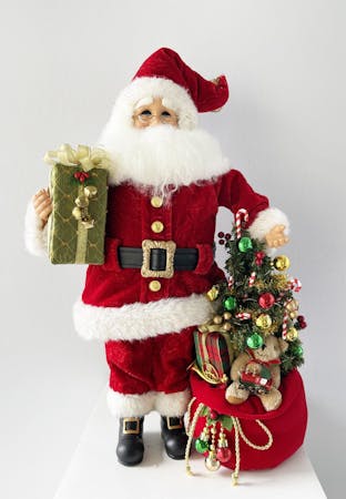 Our Lighted Santa Bearing Gifts is great for any shelf, mantle and countertop. The quality is unmatched with this decorative piece’s hand-painted face, inset eyes, unique fabric, and detailed accessories. With this item's traditional design, gift bag filled with a beautifully lit tree; he's great as a gift or as a collectible item for your own family and he’s sure to add character and style to any home. Lights are battery operated. This piece requires 2 CR2032 button batteries.