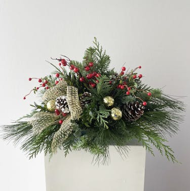 Festive holiday greens centerpiece is a long lasting, fragrant mix of holiday greenery and decor.