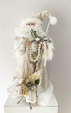 This white santa tree topper is great for any shelf, mantle, countertop or the perfect top to your tree!. The quality is unmatched with this decorative piece’s hand-painted face, inset eyes, unique fabric, and detailed accessories. With this design's elegant touch, he's sure to add character and style to any home.