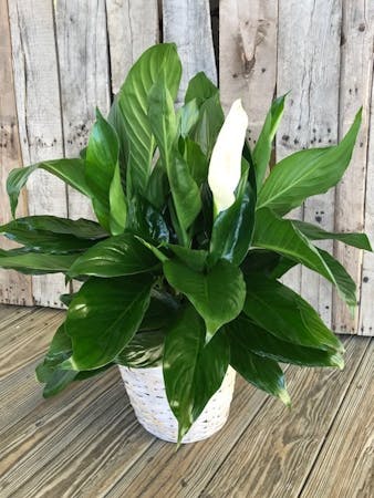 Commonly known as the Spath or Peace Lily, this large spathiphyllum plant is delivered in a basket.